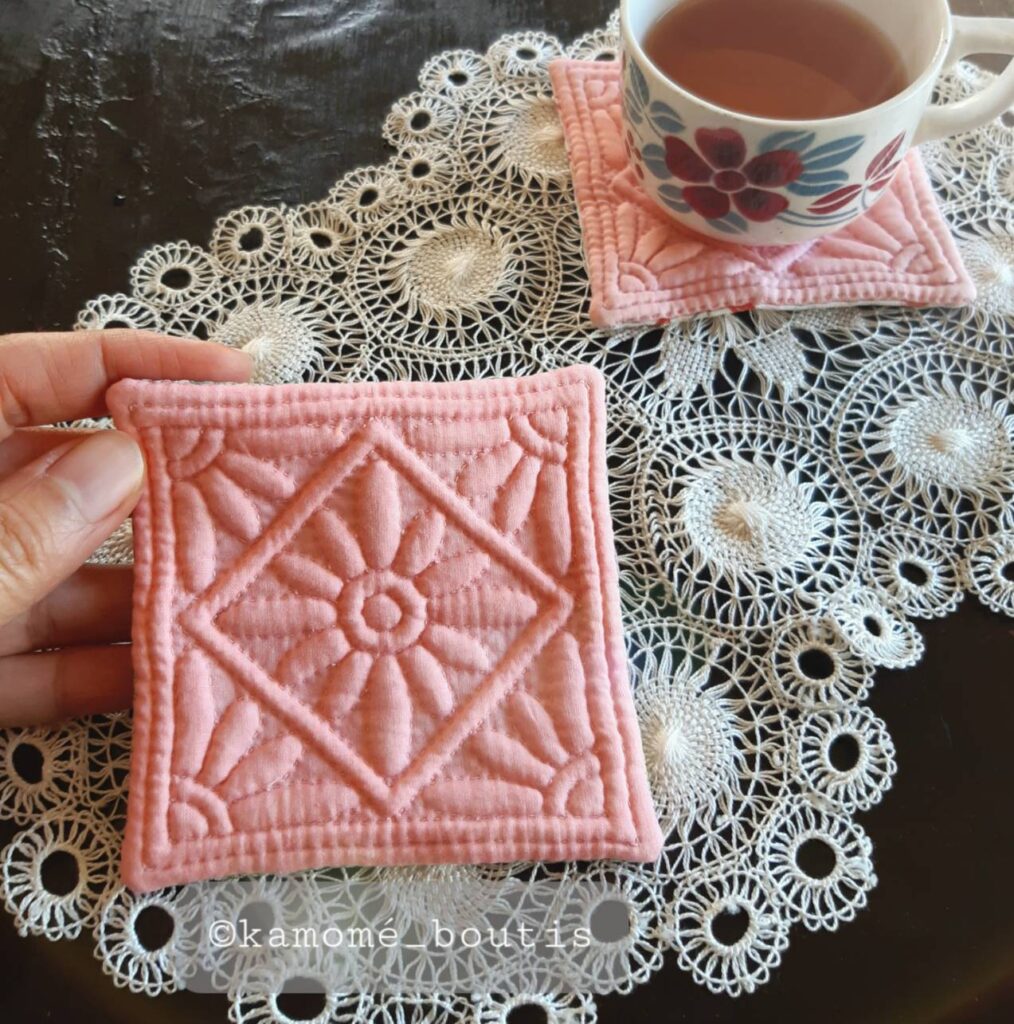 バティストと呼ばれる薄いコットン布を2枚重ね、ステッチで模様を施した後、その2枚の間にコットンヤーンを通して立体的にモチーフを浮かび上がらせます。